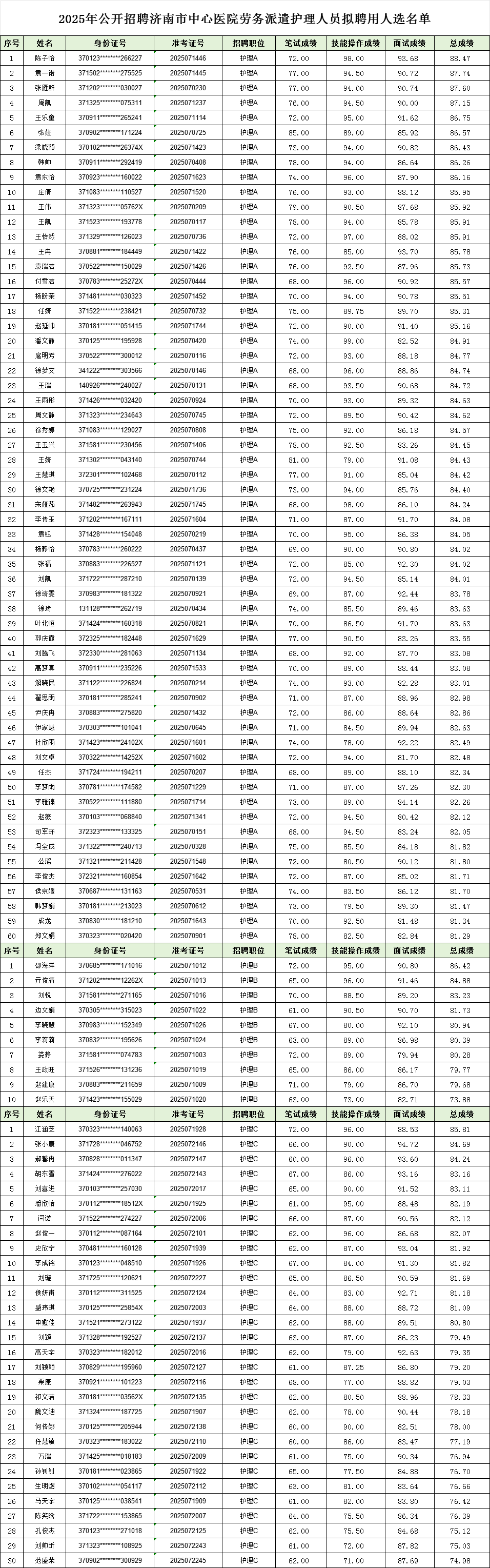 2025年公开招聘济南市中心医院劳务派遣护理人员考察体检工作现已结束,根据2025年7月2日《山东职来职往人力资源管理服务有限公司公开招聘劳务派遣工作人员简章》有关要求,现对拟聘用人员进行公示,公示期5天(工作日),自2025年8月1日至2025年8月7日。公示期间,如对公示人员有异议,请拨打监督电话0531-69905299。